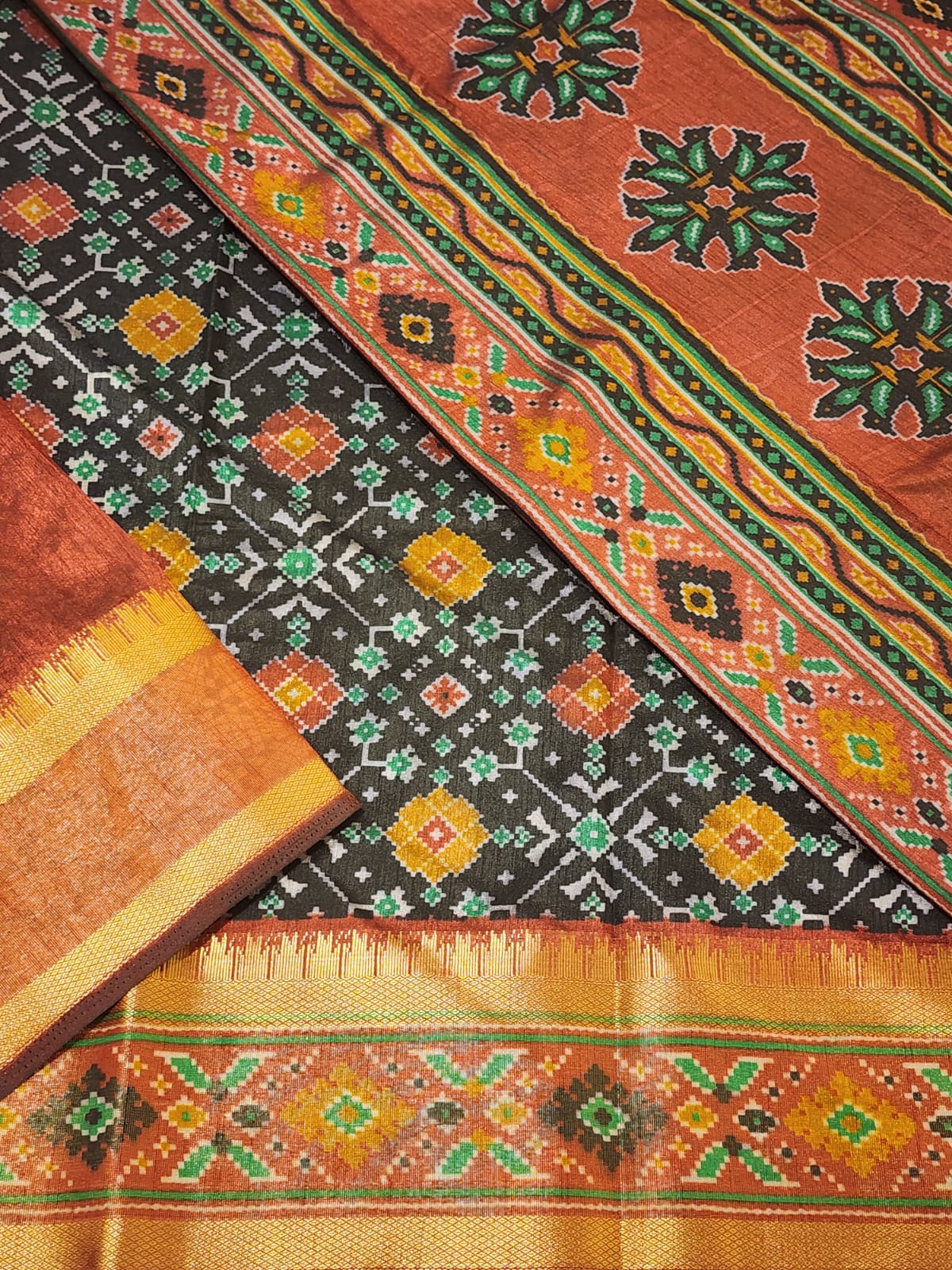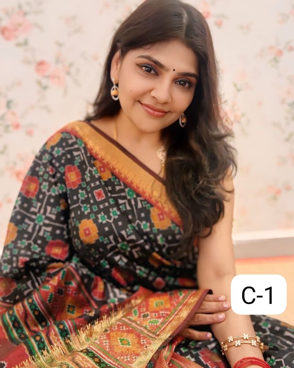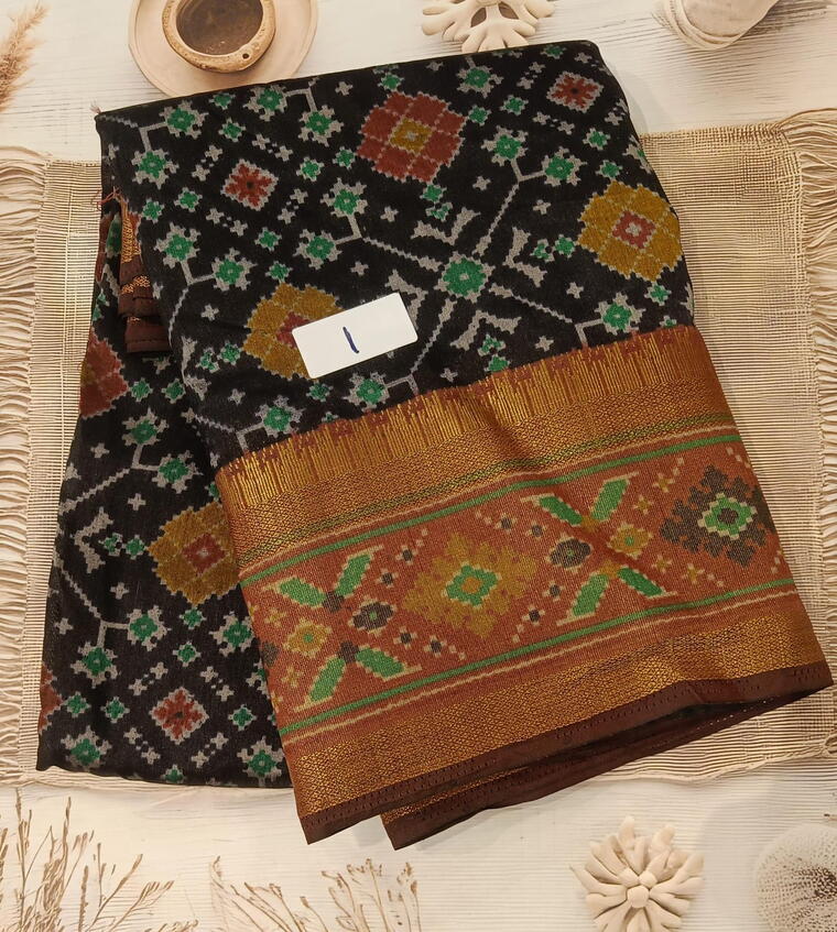 A rich black Art Silk Patola with vibrant multicolour motifs and a classic zari-style border. Lightweight, glossy and effortlessly traditional—perfect for festivals, family gatherings and cultural celebrations.