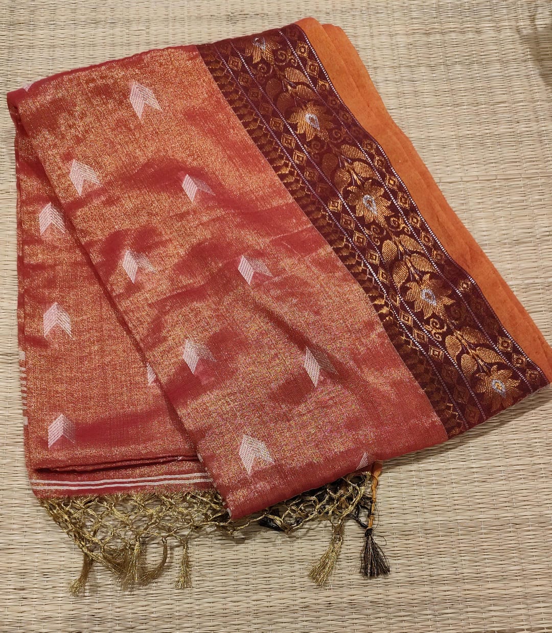 NOTE : “Pure handloom Tissue Linen saree in Rust Orange Color, woven with traditional charm and everyday comfort. Elegant, easy to drape, and made to celebrate the beauty of Indian craftsmanship.”