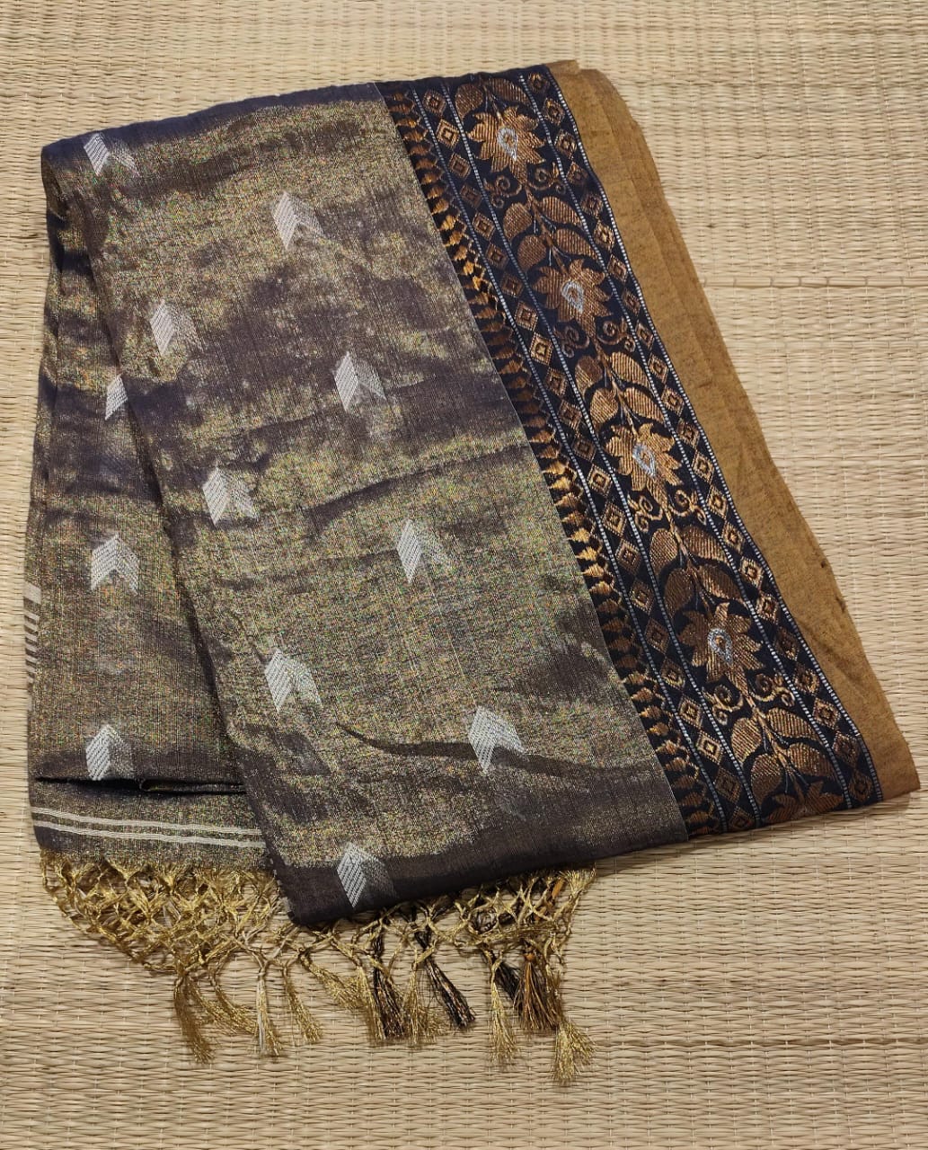 NOTE : “Pure handloom Tissue Linen saree in Elephant Grey Color, woven with traditional charm and everyday comfort. Elegant, easy to drape, and made to celebrate the beauty of Indian craftsmanship.”