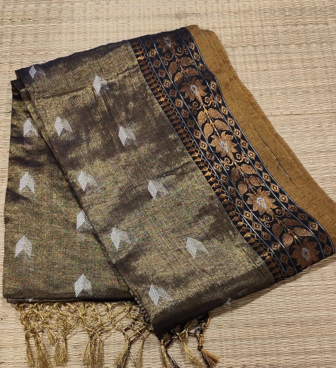 NOTE : “Pure handloom Tissue Linen saree in Elephant Grey Color, woven with traditional charm and everyday comfort. Elegant, easy to drape, and made to celebrate the beauty of Indian craftsmanship.”