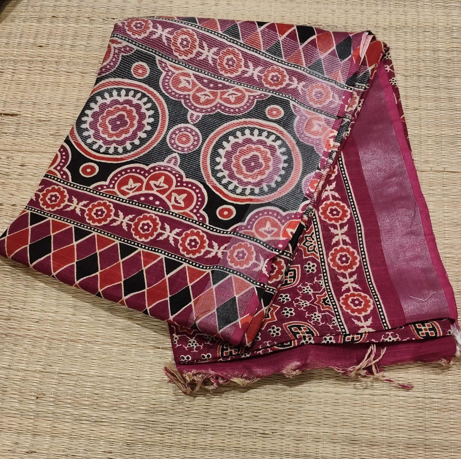 NOTE : “Pure handloom Linen Ajrak saree in Pink&Black Color, woven with traditional charm and everyday comfort. Elegant, easy to drape, and made to celebrate the beauty of Indian craftsmanship.”