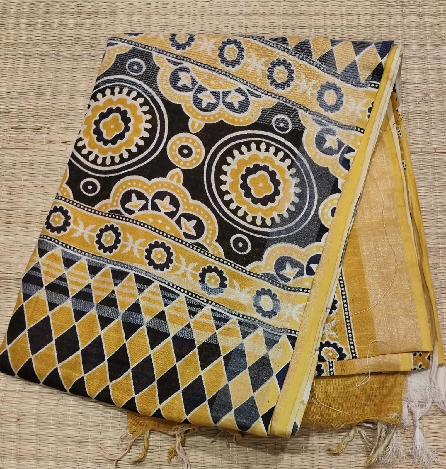 NOTE : “Pure handloom Linen Ajrak saree in Yellow&Black Color, woven with traditional charm and everyday comfort. Elegant, easy to drape, and made to celebrate the beauty of Indian craftsmanship.”