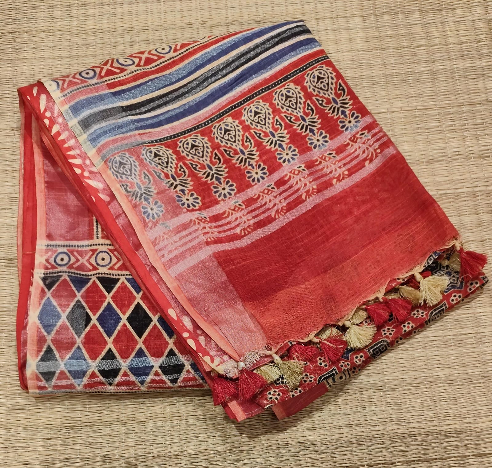 NOTE : “Pure handloom Linen Ajrak saree in RedColor, woven with traditional charm and everyday comfort. Elegant, easy to drape, and made to celebrate the beauty of Indian craftsmanship.”