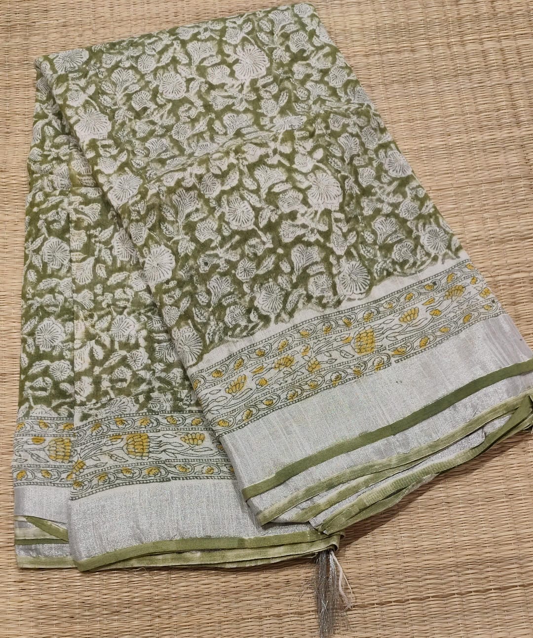 NOTE : Pure handloom Jaipur Linen Printed saree in Green Color, woven with traditional charm and everyday comfort. Elegant, easy to drape, and made to celebrate the beauty of Indian craftsmanship.