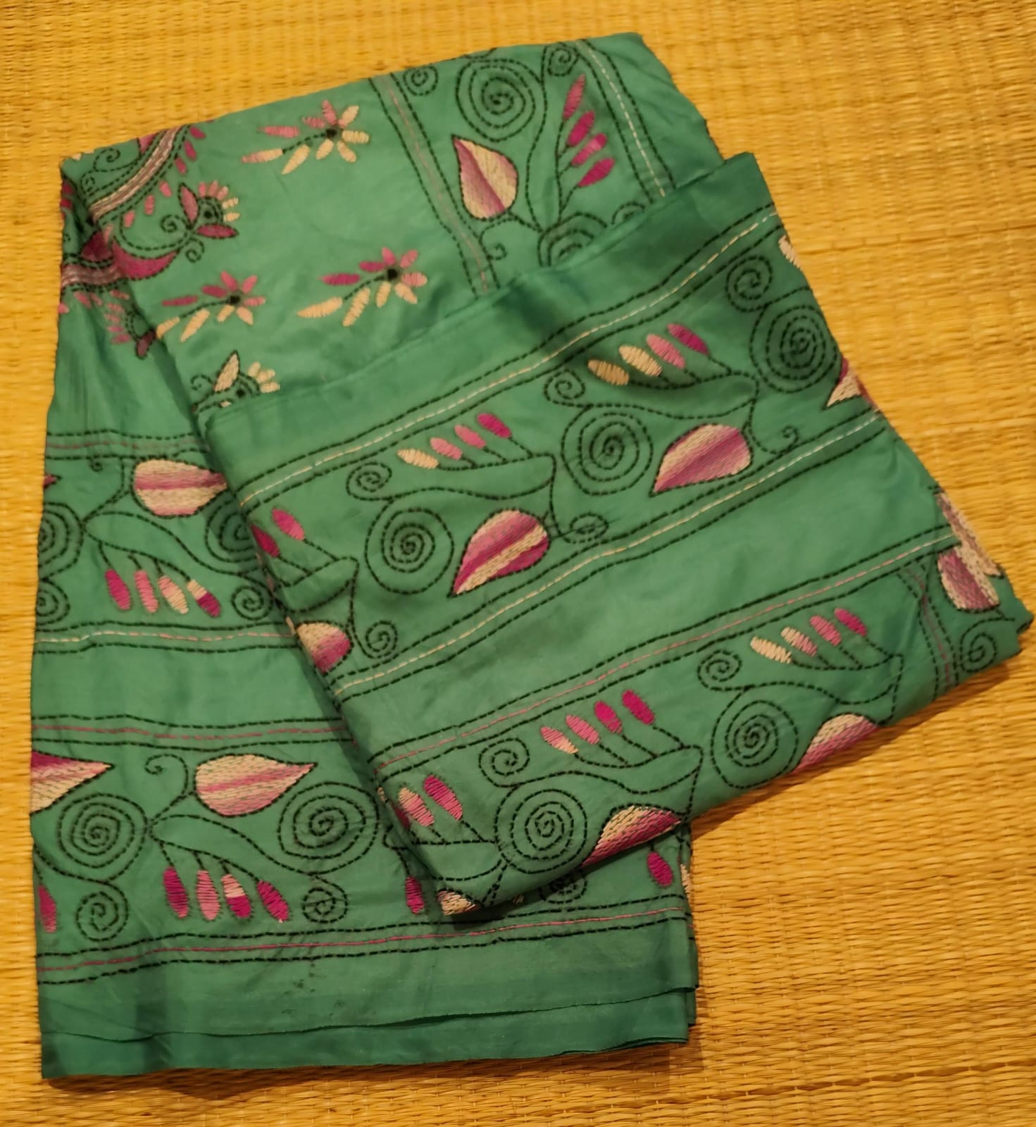 NOTE : Pure handloom Soft Silk with Kantha Stitch saree in Green Color, woven with traditional charm and everyday comfort. Elegant, easy to drape, and made to celebrate the beauty of Indian craftsmanship.