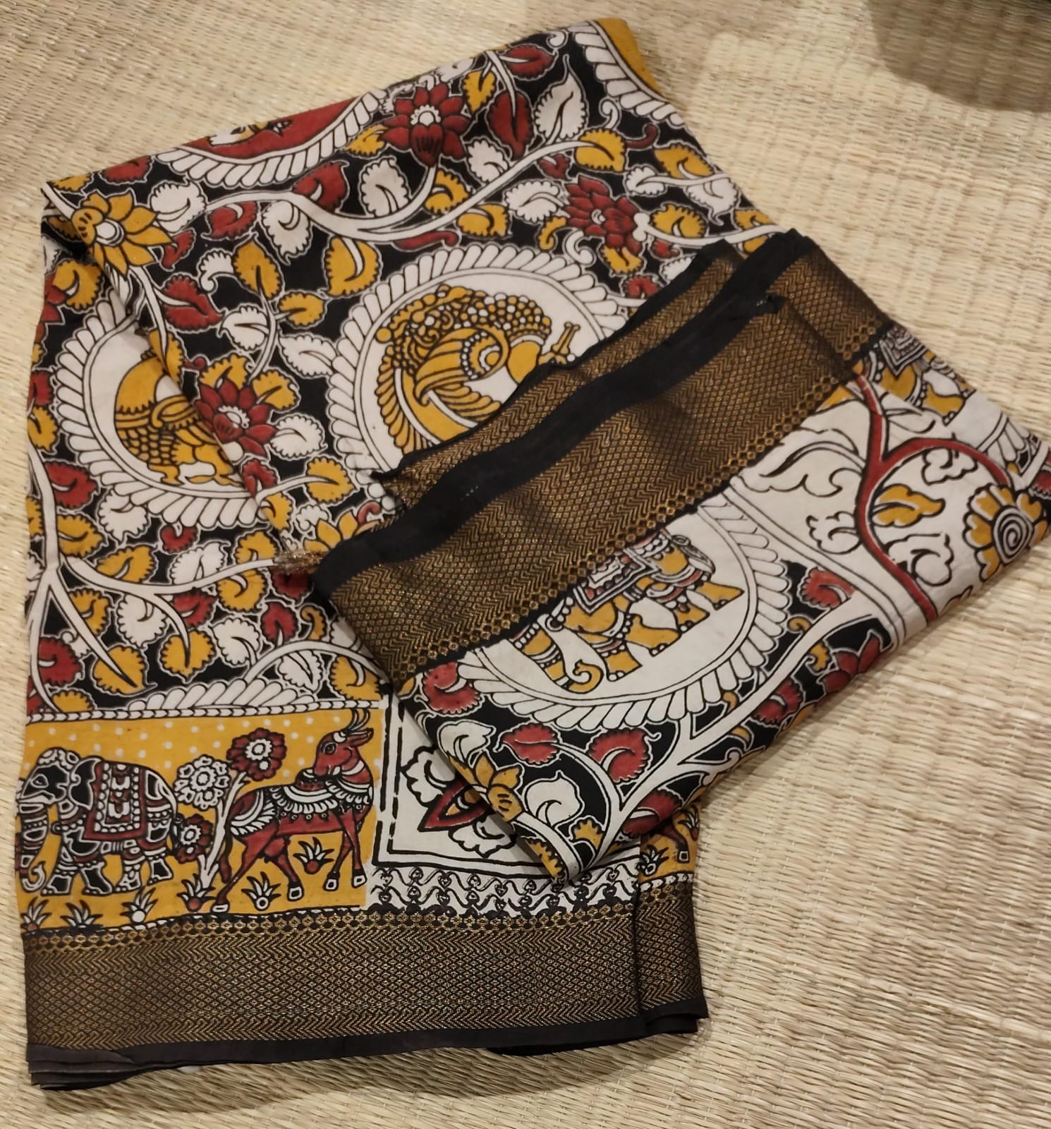 NOTE : Pure handloom Mangalagiri Silk with Kalamlari Printed saree, woven with traditional charm and everyday comfort. Elegant, easy to drape, and made to celebrate the beauty of Indian craftsmanship.