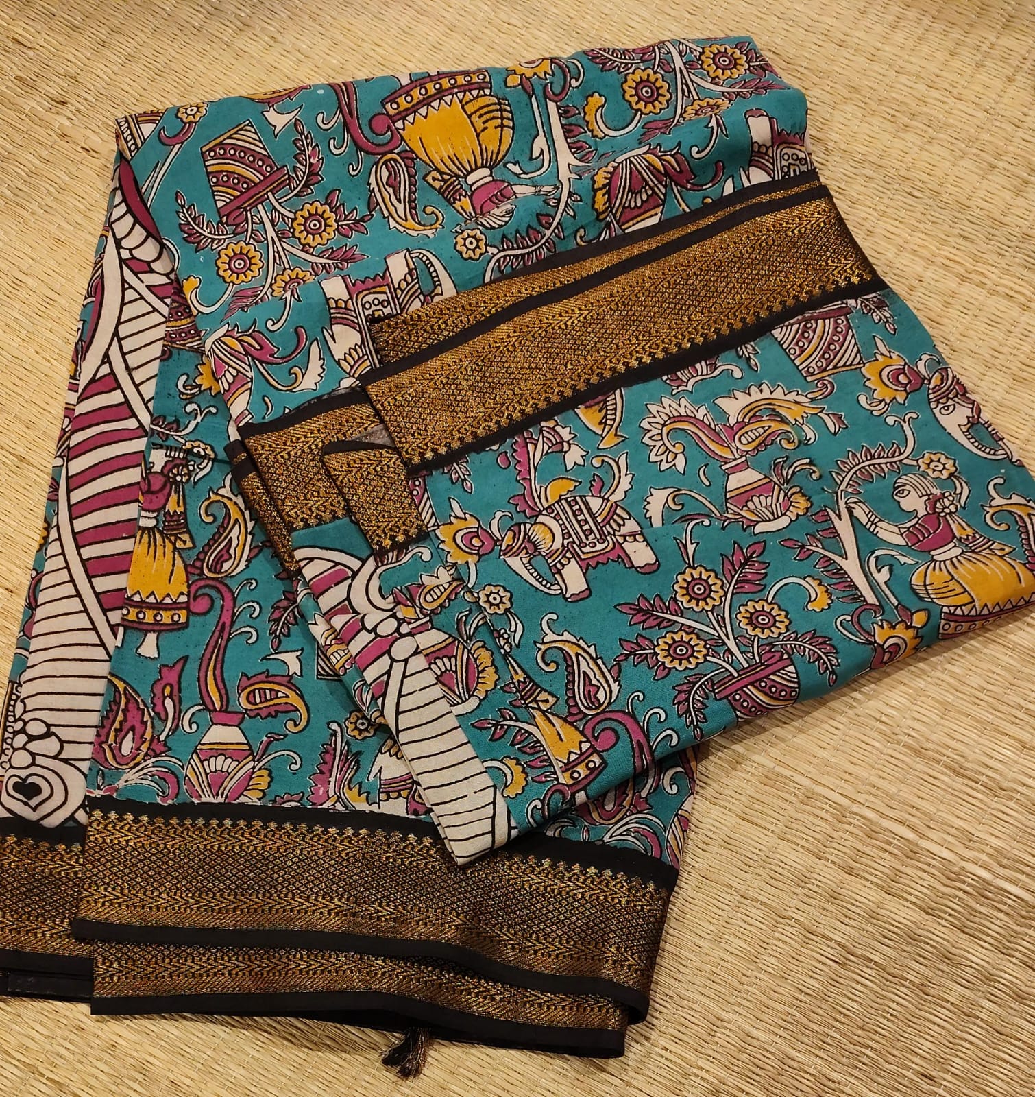 NOTE : Pure handloom Mangalagiri Silk with Kalamlari Printed saree, woven with traditional charm and everyday comfort. Elegant, easy to drape, and made to celebrate the beauty of Indian craftsmanship.