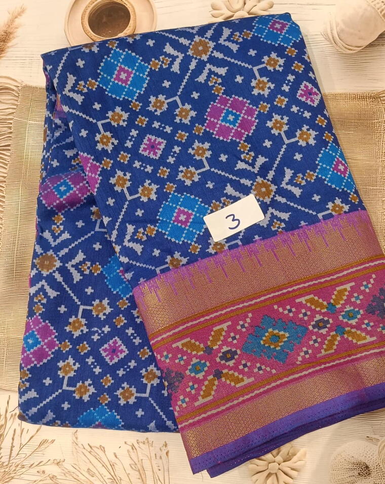 A striking royal blue printed Patola with bold geometric motifs and a zari-inspired dual-tone border. Soft, lightweight and festive—ideal for parties, receptions and traditional events.
