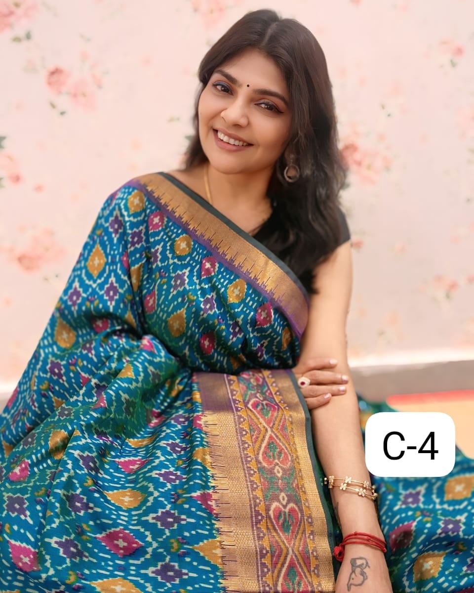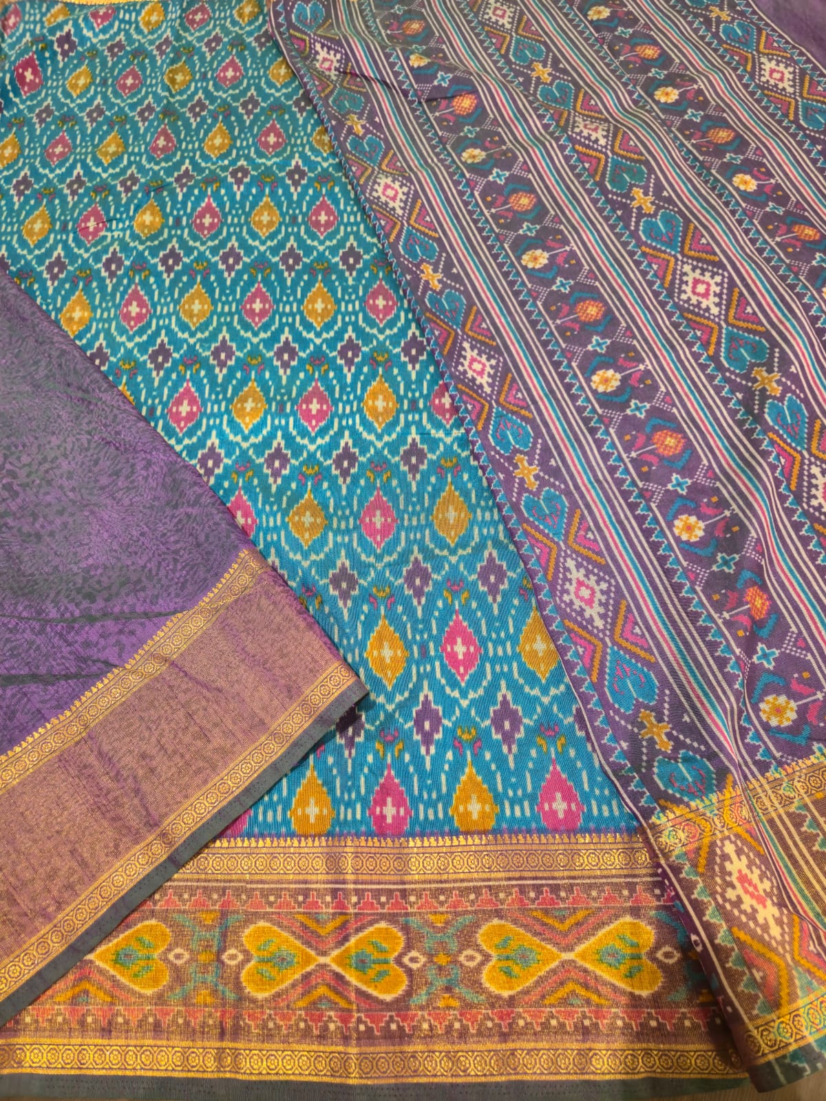 Refreshing teal Art Silk accented with colourful Patola motifs and an antique gold border. Perfect for daytime celebrations, ceremonies and elegant ethnic styling.